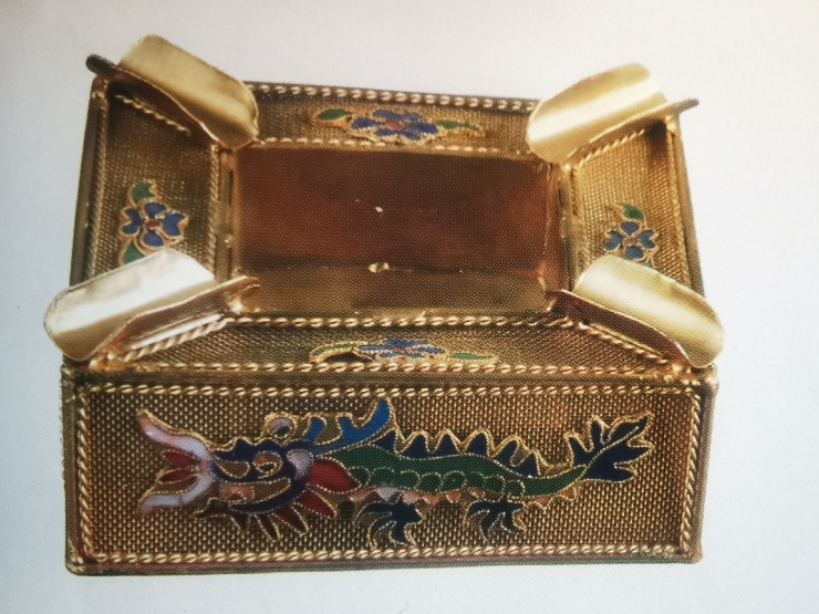 此具煙缸為金屬和貼布材質(zhì),無足。貼布顏色亦為金色,與金屬色澤煙缸融為一體,凸顯高貴氣質(zhì)。方形煙缸的四面貼布都繡上了一模一樣的彩龍,龍兒色彩繽紛,龍須挺立,龍翼飄逸,洋洋得意地傲嬌舞游。它們亦口含龍珠,據(jù)說龍口含寶珠,能增強智慧、勇氣和力量。每條龍都用金色粗絲線勾勒,立體感滿滿。煙缸面上貼布繡有四株四葉草,綠葉藍瓣,四葉草又名幸運草,象征愛情、健康、財富和幸運,美好的祝福如吉祥的龍圖騰一樣。