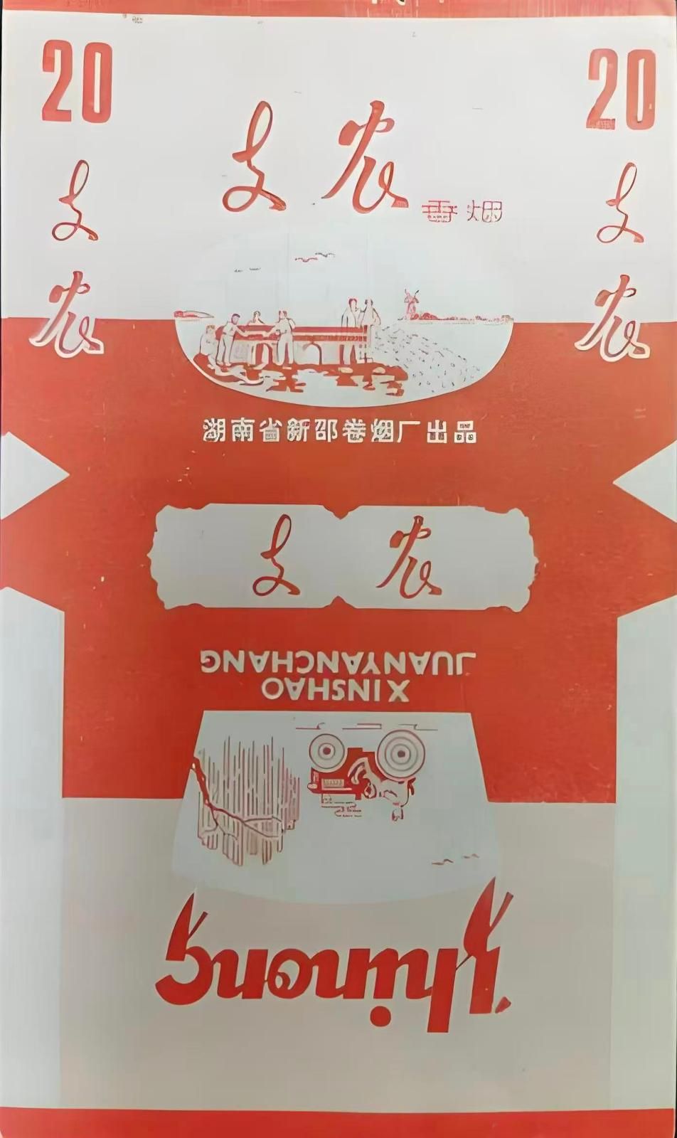 ①上世紀六七十年代,湖南新邵卷煙廠出品的“支農(nóng)”牌香煙,其煙標設(shè)計于主版以紅白配色為主,圖案簡潔明快:上方描繪一群工人支援農(nóng)業(yè)、修建水渠引水灌溉的場景;副版采用扇形框設(shè)計,展現(xiàn)春分時節(jié)的農(nóng)村景象,如楊柳倒垂、農(nóng)婦駕駛拖拉機耕地,突出農(nóng)業(yè)生產(chǎn)的繁忙與希望。