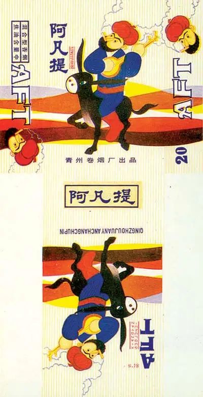 上世紀(jì)80年代,山東青州卷煙廠曾出品“阿凡提”煙標(biāo),該煙標(biāo)主副版圖案基本相同,展現(xiàn)了口叼香煙、騎在毛驢上彈奏樂(lè)器冬不拉的阿凡提的卡通形象。