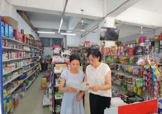 圖為法規(guī)員(右)向商戶宣傳未成年人保護(hù)法