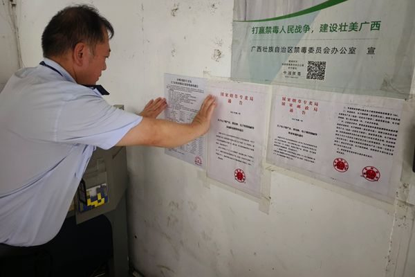 宜州煙草工作人員向轄區(qū)物流寄遞企業(yè)網(wǎng)點張貼公告。韋東攝